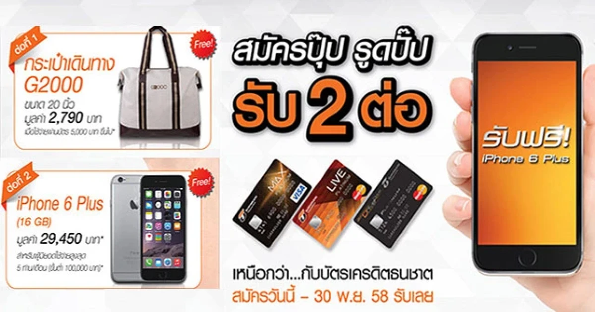 เมื่อใช้จ่ายผ่านบัตร 5,000 บาท ขึ้นไป - ต่อที่ 2 รับ iPhone 6 Plus (16GB) มูลค่า 29,450 บาท