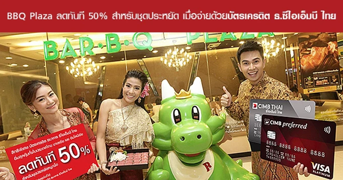 - บริษัท บาร์บีคิวพลาซ่า จำกัด มอบส่วนลดให้ผู้ถือบัตรเครดิตที่เข้าร่วมรายการ เมื่อสั่งชุดพิเศษชุดใดก็ได้จากร้านบาร์บีคิวพลาซ่า รับสิทธิ์ส่วนลด 50% สำหรับชุดประหยัดหมู/เนื้อ ทั้งนี้ ผู้รับสิทธิ์ส่วนลด 50% ดังกล่าวต้องสั่งชุดประหยัดหมู/เนื้อ พร้อมกับชุดพิเศษ และชำระค่าอาหารและบริการด้วยบัตรเครดิตธนาคาร ซีไอเอ็มบี ไทย รวมในใบเสร็จเดียวกัน โดยจำกัด 1 สิทธิ์ /ต่อ 1 ใบเสร็จ /ต่อโต๊ะ เท่านั้น สามารถใช้ได้ไม่จำกัดครั้งตลอดรายการส่งเสริมการใช้บัตร
