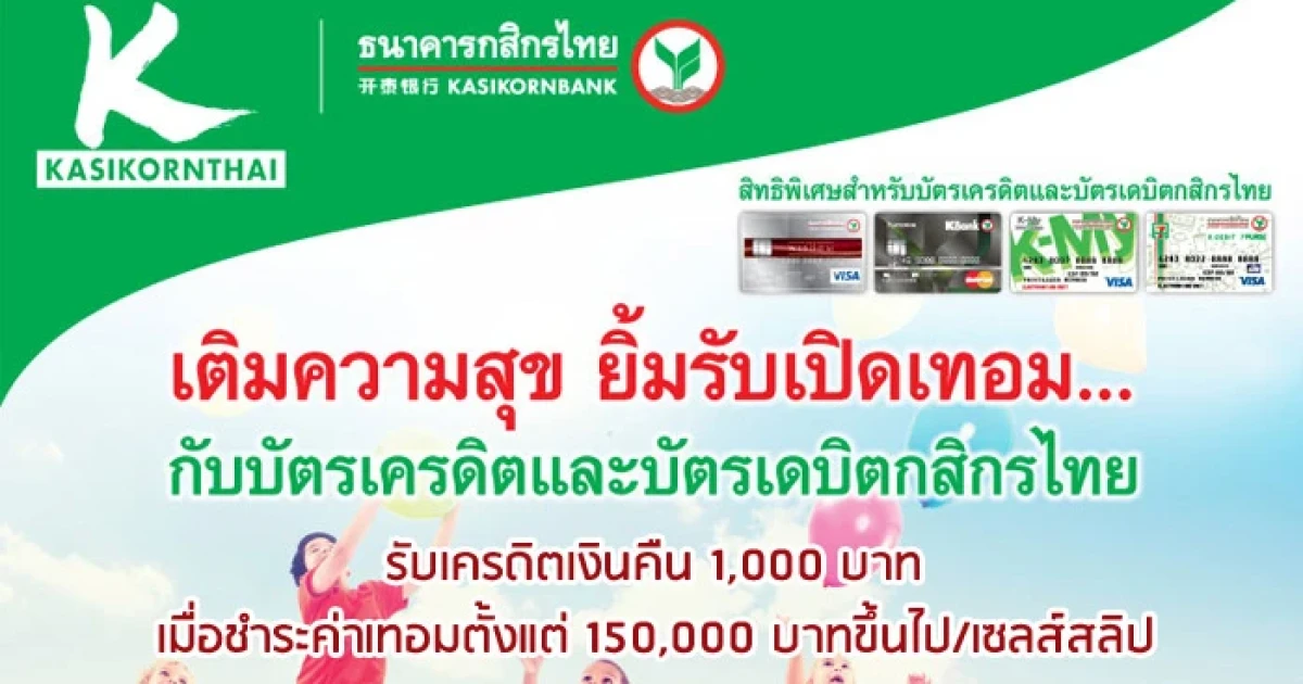 เติมความสุข ยิ้มรับเปิดเทอม...กับบัตรเครดิตและบัตรเดบิตกสิกรไทย รับเครดิตเงินคืน 1,000 บาท เมื่อชำระค่าเทอมตั้งแต่ 150,000 บาทขึ้นไป/เซลส์สลิป และรับเครดิตเงินคืน 500 บาท เมื่อชำระค่าเทอมตั้งแต่ 70,000 บาทขึ้นไป/เซลส์สลิป