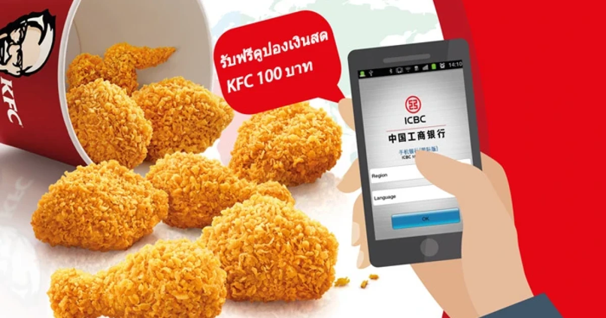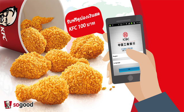 รับฟรี! คูปองเงินสด KFC 100 บาท เมื่อเพิ่มบัญชีบัตรเครดิตหรือทำรายการโอนเงินหยวนไปประเทศจีน ผ่านช่องทางบริการ ICBC Personal Internet Banking and Mobile Banking ตั้งแต่วันนี้ ถึง 31 ม.ค. 59 เท่านั้น