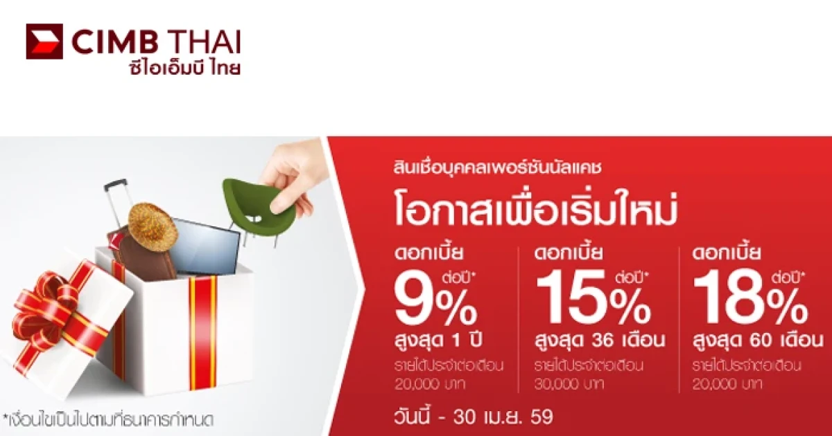 โอกาสเพื่อเริ่มใหม่ สำหรับพนักงานที่มีรายได้ประจำ อัตราดอกเบี้ยตลอดอายุสัญญา ฟรี! ค่าธรรมเนียมการดำเนินการสินเชื่อ และค่าอากรแสตมป์ วันนี้ - 30 เม.ย. 59