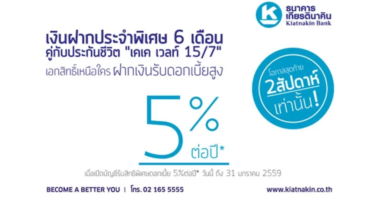 เงินฝากประจำพิเศษ 6 เดือน คู่กับประกันชีวิต "เคเค เวลท์ 15/7" รับดอกเบี้ยสูง 5% จาก ธ.เกียรตินาคิน