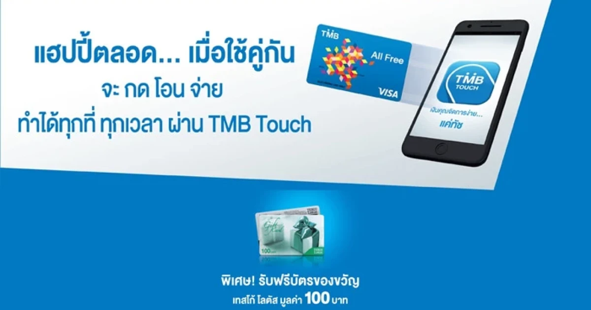 รับฟรี! บัตรของขวัญ 100 บาท เมื่อเปิดบัญชี TMB All Free พร้อมบัตรเดบิตและจ่ายบิลผ่าน TMB Touch