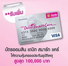 พิเศษ สำหรับลูกค้าที่มีวงเงินกู้ตั้งแต่ 2.5 ล้านบาทขึ้นไป (รวมวงเงินกู้ประกันชีวิตเพื่อประกันสินเชื่อ และวงเงินกู้เพื่ออุปโภคบริโภค ซึ่งต้องเป็นหลักประกัน และจดจำนองในวันเดียวกัน) รับบัตรออมสิน เดบิต สมาร์ท แคร์ ให้ความคุ้มครองประกันอุบัติเหตุสูงสุด 100,000 บาท