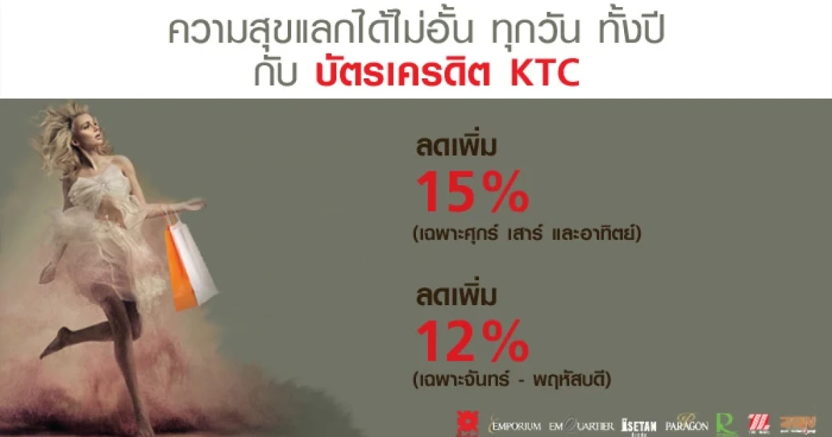 รับส่วนลดสูงสุด 15% ทุกวัน ทั้งปี เมื่อช้อปที่ห้างสรรพสินค้าชั้นนำ กับบัตรเครดิต KTC