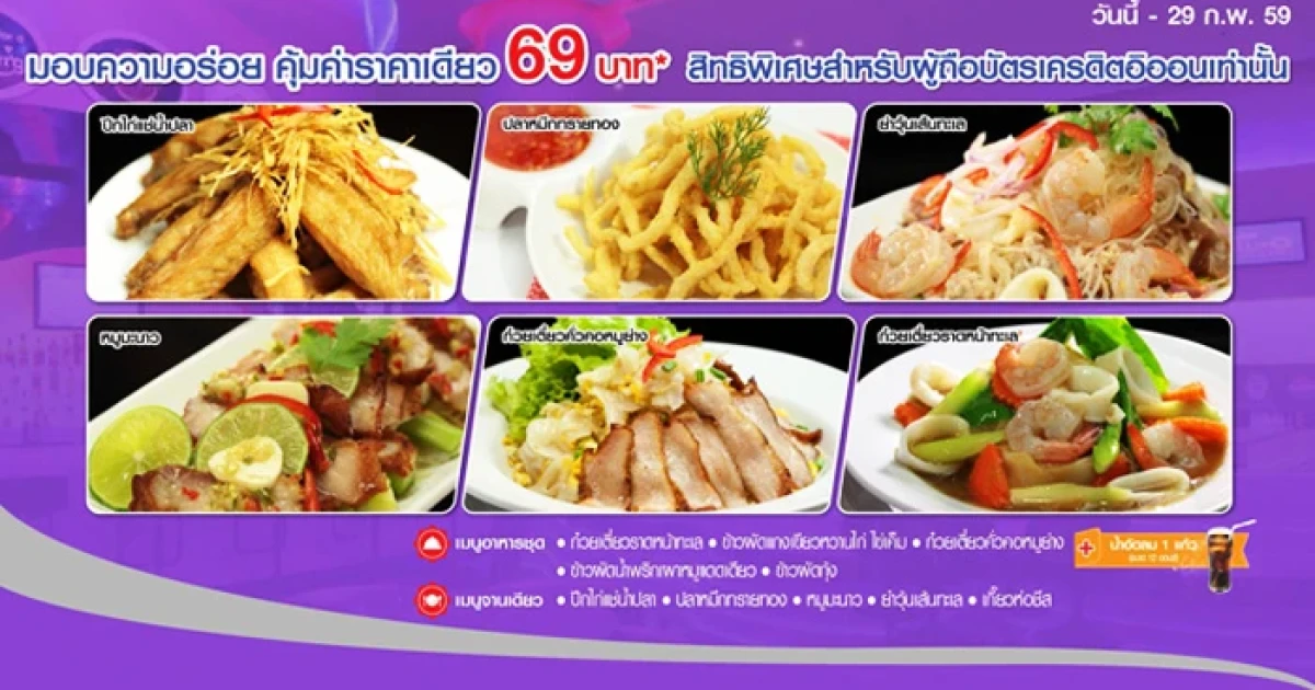 - จำกัดจำนวนการใช้สิทธิ์ 3 ชุด/ บัตร/ วัน และจำกัดสิทธิ์ 5,000 สิทธิ์ ต่อเดือน สำหรับเมนูพิเศษราคา 69 บาท
