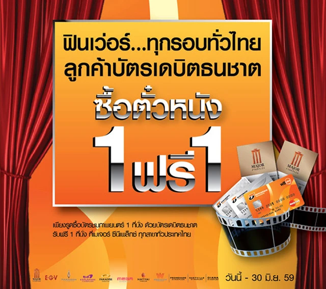 ฟินเว่อร์...ทุกรอบทั่วไทย เพียงรูดซื้อบัตรชมภาพยนตร์ 1 ที่นั่ง ด้วยบัตรเดบิตธนชาต รับฟรีอีก 1 ที่นั่ง ที่โรงภาพยนตร์เครือเมเจอร์ ซีนีเพล็กซ์ ทุกสาขาทั่วประเทศไทย