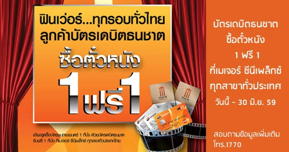 ฟินเว่อร์...ทุกรอบทั่วไทย เพียงรูดซื้อบัตรชมภาพยนตร์ 1 ที่นั่ง ด้วยบัตรเดบิตธนชาต รับฟรีอีก 1 ที่นั่ง ที่โรงภาพยนตร์เครือเมเจอร์ ซีนีเพล็กซ์ ทุกสาขาทั่วประเทศไทย