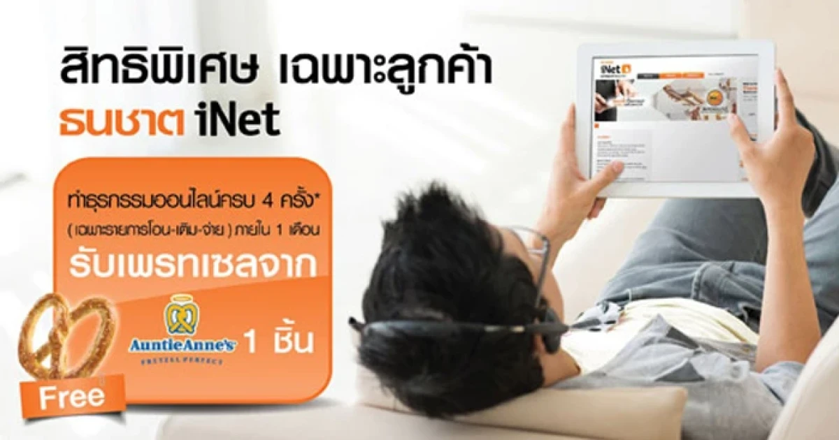 รับฟรี! เพรทเซล AuntieAnne's 1 ชิ้น สำหรับลูกค้าธนชาต iNET เมื่อทำธุรกรรมออนไลน์ครบ 4 ครั้ง เฉพาะรายการโอน, เติม, จ่าย ภายใน 1 เดือน เพียงแสดง SMS จากธนาคารฯ เพื่อรับสิทธิ์ได้ที่อานตี้ แอนส์ ทุกสาขาที่ร่วมรายการ
