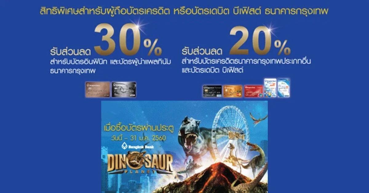 สิทธิพิเศษสำหรับผู้ถือบัตรเครดิต หรือบัตรเดบิต บีเฟิสต์ ธนาคารกรุงเทพ รับส่วนลดสูงสุด 30% เมื่อซื้อบัตรเข้าชม Dinosaur Planet
