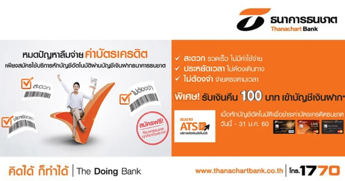 รับเงินคืน 100 บาท เมื่อสมัครใช้บริการหักบัญชีอัตโนมัติจ่ายค่าบัตรเครดิต จาก ธ.ธนชาต