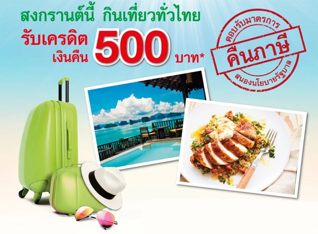 สงกรานต์นี้ กิน เที่ยว ทั่วไทย รับเครดิตเงินคืนสูงสุด 500 บาท เมื่อมียอดใช้จ่ายสะสมในหมวดโรงแรม และร้านอาหารครบ 20,000 บาทขึ้นไป จากบัตรเครดิตกสิกรไทย