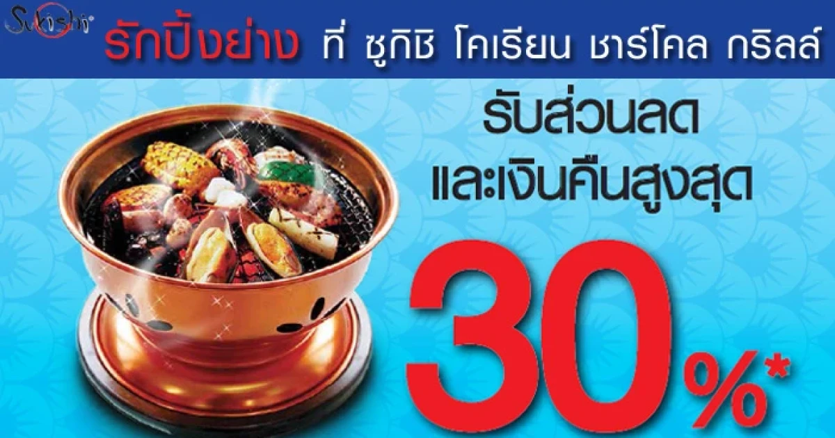 รับส่วนลดและเงินคืนสูงสุด 30% ที่ร้านซูกิชิ โคเรียน ชาร์โคล กริลล์ เมื่อจ่ายผ่านบัตรฯ ธ.กรุงเทพ