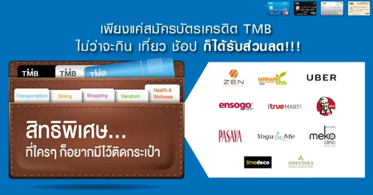 สิทธิพิเศษ... ที่ใครๆ ก็อยากมีไว้ติดกระเป๋า สมัครบัตรเครดิต TMB วันนี้! ไม่ว่าจะกิน เที่ยว ช้อป ชิลล์ ก็ได้รับส่วนลดและดีลเด็ดอีกเพียบ จากธนาคารทหารไทย