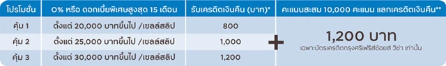 - คะแนนสะสม 10,000 คะแนน/ 1 เครื่อง แลกรับเครดิตเงินคืน 1,200 บาท จำกัดการแลกคะแนน 1 สิทธิ์ ต่อ 1 หมายเลขบัตรเครดิต โดยบริษัทจะเครดิตเข้าบัญชีภายใน 45 วัน หลังจบรายการ