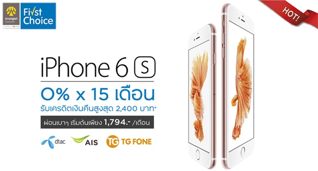 Hot Deal ห้ามพลาด!! ผ่อน iPhone 6s 0% นาน 15 เดือน พร้อมรับเครดิตเงินคืนสูงสุด 2,400 บาท ผ่อนเบาๆ เริ่มต้นเพียง 1,794 บาท/ เดือน เท่านั้น จากบัตรเครดิตกรุงศรี เฟิร์สช้อยส์