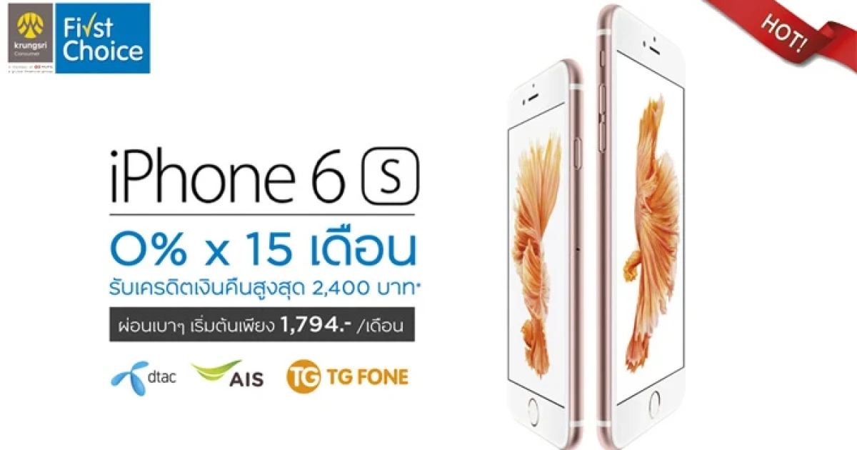 Hot Deal ห้ามพลาด!! ผ่อน iPhone 6s 0% นาน 15 เดือน พร้อมรับเครดิตเงินคืนสูงสุด 2,400 บาท ผ่อนเบาๆ เริ่มต้นเพียง 1,794 บาท/ เดือน เท่านั้น จากบัตรเครดิตกรุงศรี เฟิร์สช้อยส์