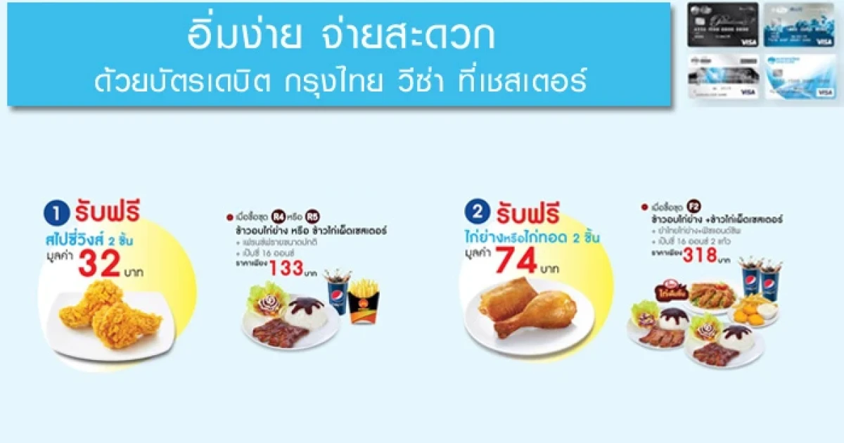อิ่มง่าย จ่ายสะดวก รับฟรี 2 เมนูพิเศษ เมื่อทานอาหารที่ร้านเชสเตอร์ และชำระด้วย บัตรเดบิต กรุงไทย วีซ่า