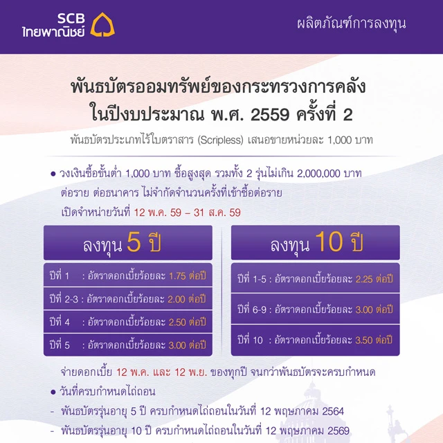 ธนาคารไทยพาณิชย์ เปิดจำหน่ายพันธบัตรออมทรัพย์ของกระทรวงการคลัง ในปีงบประมาณ พ.ศ. 2559 ครั้งที่ 2 แบบไร้ตราสาร (Scripless) เสนอขายหน่วยละ 1,000 บาท
