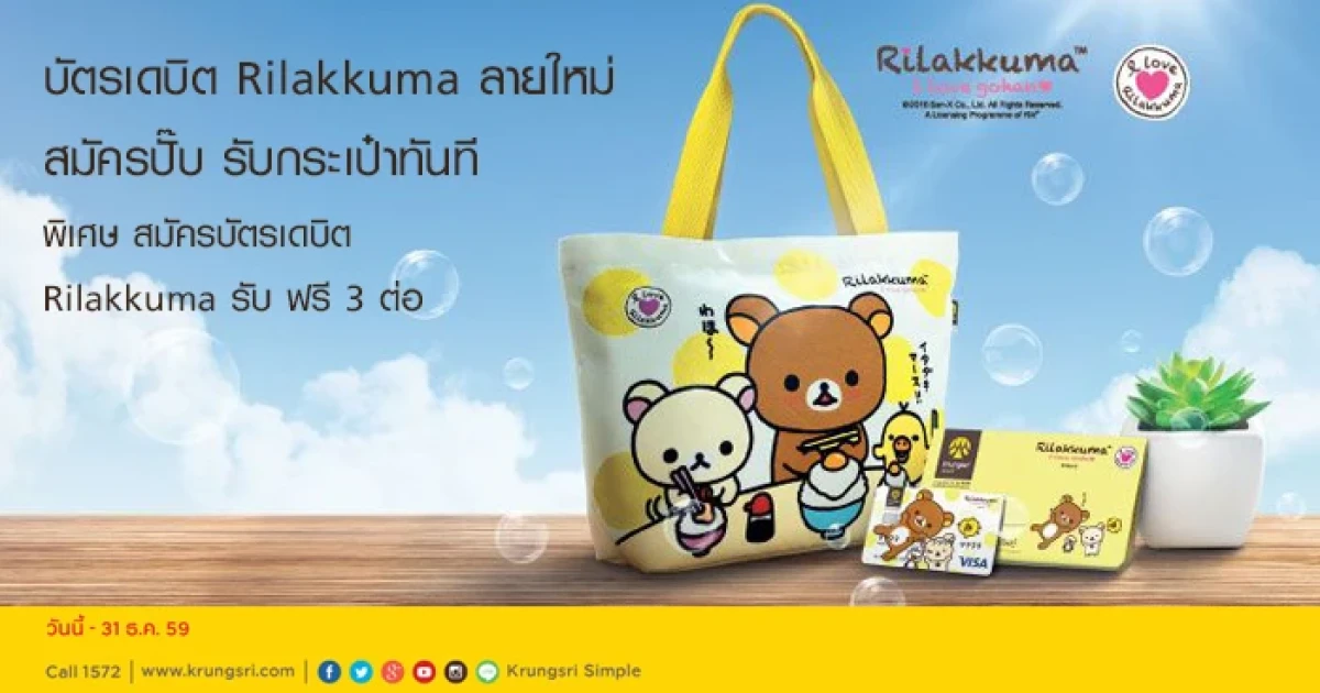 สมัครปั๊บ รับฟรี! 3 ต่อ บัตรเดบิต Rilakkuma Limited Edition ลายใหม่ จาก ธ.กรุงศรี
