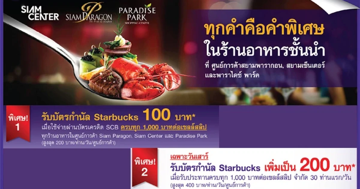 ทุกคำคือคำพิเศษ.. รับบัตรกำนัล Starbucks มูลค่าสูงสุด 200 บาท เมื่อใช้จ่ายในร้านอาหารชั้นนำ ที่ศูนย์การค้าสยามพารากอน, สยามเซ็นเตอร์ และพาราไดซ์ พาร์ค ด้วย บัตรเครดิตไทยพาณิชย์ ตามที่กำหนด ดังนี้