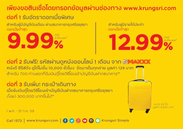 - สำหรับท่านที่รับเงินกู้โดยวิธีโอนเงินเข้าบัญชีเงินฝากธนาคารกรุงศรีอยุธยา ตั้งแต่ 300,000 บาทขึ้นไป ธนาคารจะจัดส่งกระเป๋าเดินทางให้ทางไปรษณีย์ ภายในวันที่ 31 ต.ค. 59