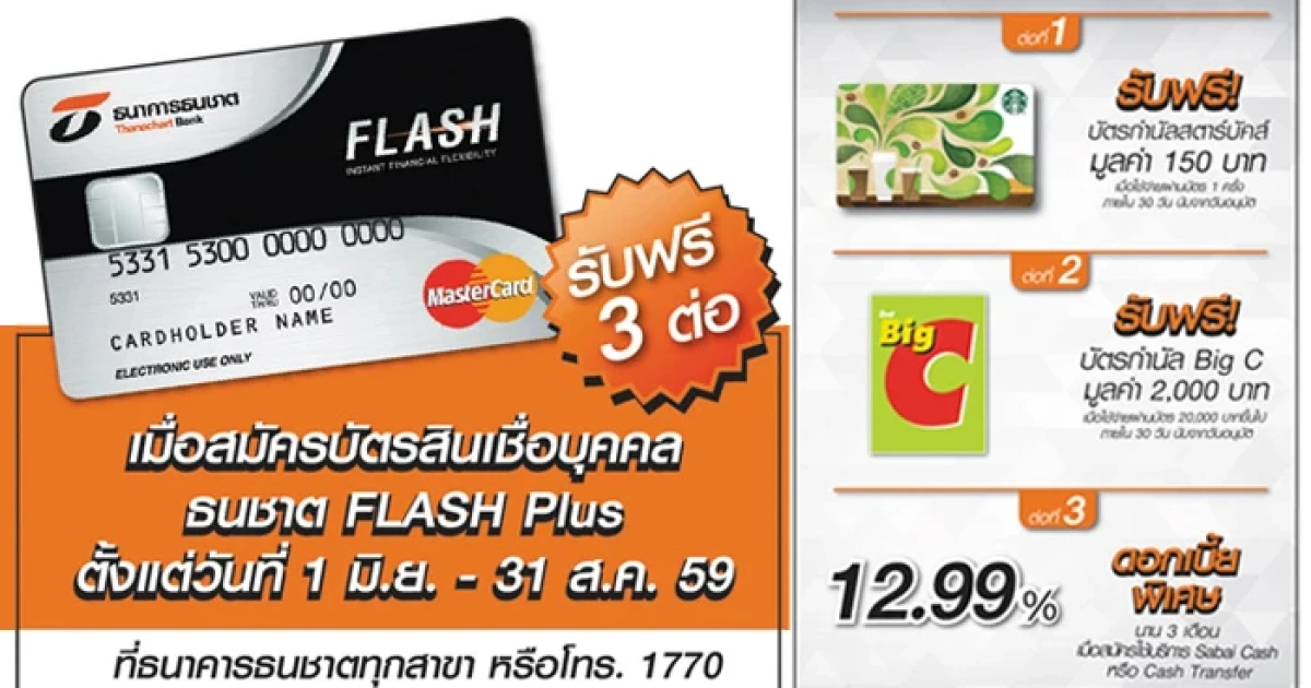 บัตรเดียวให้คุ้ม รับฟรี 3 ต่อ สมัครสินเชื่อส่วนบุคคล ธนชาต FLASH PLUS วันนี้ รับฟรี! บัตรกำนัลสตาร์บัคส์ มูลค่า 150 บาท, บัตรกำนัล Bic C มูลค่า 2,000 บาท และอัตราดอกเบี้ยพิเศษ 12.99% นาน 3 เดือน