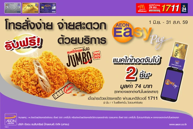 รับฟรี! แมคไก่ทอดจัมโบ้ 2 ชิ้น มูลค่า 74 บาท เมื่อโทรสั่งผ่านแมคดิลิเวอรี่ 1711 (เฉพาะบริการจัดส่งถึงบ้านเท่านั้น) ตั้งแต่ 300 บาทขึ้นไป และชำระด้วยบัตรเครดิตอิออน หรือชำระด้วยบัตรเครดิต VISA/ MasterCard ทุกธนาคาร ตั้งแต่ 500 บาทขึ้นไป (ยอดใช้จ่ายดังกล่าว ไม่รวมค่าบริการจัดส่ง 40 บาท)