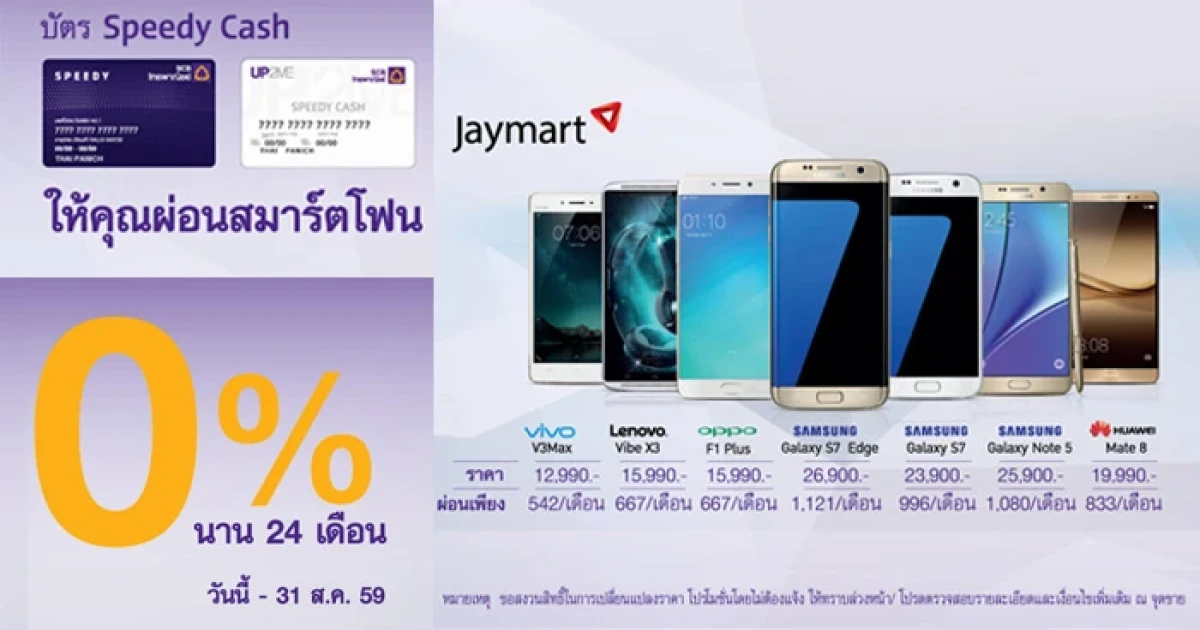บัตรสินเชื่อ Speedy Cash และบัตรอัพทูมี Speedy Cash มอบสิทธิพิเศษให้คุณผ่อนสมาร์ทโฟนสบายๆ 0% นาน 24 เดือน เมื่อซื้อสินค้าที่ร่วมรายการ ที่ร้านค้า Jaymart วันนี้ - 31 ส.ค. 59
