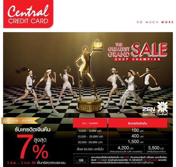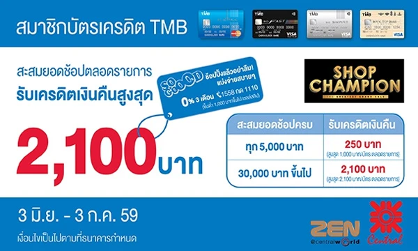 รายละเอียดโปรโมชั่น : รับเครดิตเงินคืนสูงสุด 1,000 บาท เมื่อมียอดใช้จ่ายสะสมผ่านบัตรทุกๆ 3,000 บาท ที่ห้างสรรพสินค้าเซ็นทรัลทุกสาขา และ ZEN (จำกัด 1,000 บาท/ บัญชี ตลอดรายการ)
