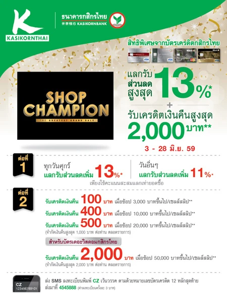 ส่ง SMS ภายในวันที่ซื้อสินค้าเพื่อรับสิทธิ์เครดิตเงินคืน : พิมพ์ CEN เว้นวรรค ตามด้วยหมายเลขบัตร 16 หลัก ส่งมาที่ 4806026 (ครั้งละ 3 บาท) - ต่อที่ 2 แลกรับเครดิตเงินคืน 13% ด้วยคะแนนสะสมเท่ายอดซื้อ ขั้นต่ำ 3,000 บาทขึ้นไป หรือแลกคะแนนขั้นต่ำ 3,000 คะแนน
