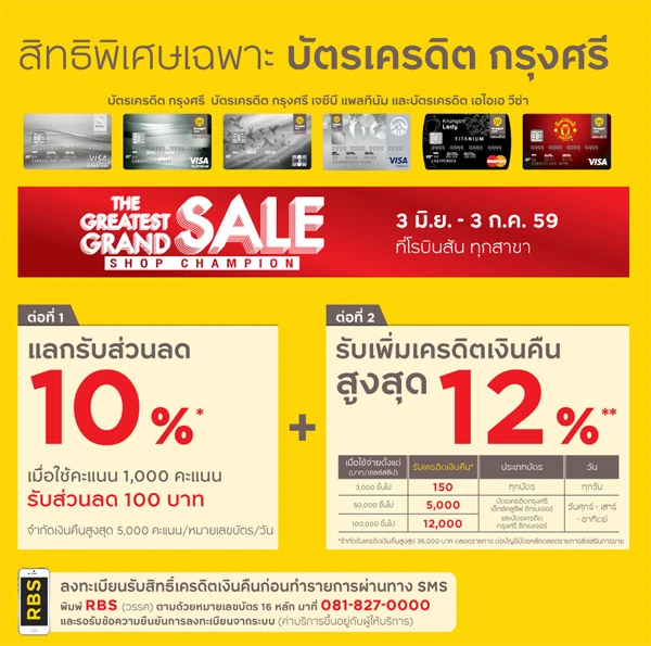 - รับเครดิตเงินคืน 5,000 บาท เมื่อช้อปตั้งแต่ 50,000 บาทขึ้นไป/ เซลล์สลิป สำหรับบัตรเครดิตกรุงศรี เอ็กซ์คลูซีฟ ซิกเนเจอร์ และบัตรเครดิตกรุงศรี ซิกเนเจอร์ เฉพาะวันศุกร์, เสาร์ และอาทิตย์