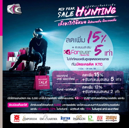 รายละเอียดโปรโมชั่น : แลกรับส่วนลดเพิ่มสูงสุด 15% + รับคะแนนสะสมเพิ่มสูงสุด 5 เท่า (ไม่จำกัดยอดรับสูงสุดตลอดรายการ) เมื่อช้อปที่ห้างสรรพสินค้าชั้นนำที่ร่วมรายการ