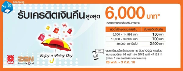 รายละเอียดโปรโมชั่น : รับเครดิตเงินคืนสูงสุด 6,000 บาท เมื่อช้อปที่ห้างสรรพสินค้าเซ็นทรัลทุกสาขา และเซน