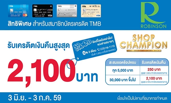 รายละเอียดโปรโมชั่น : รับเงินคืนสูงสุด 2,100 บาท เพียงสะสมยอดใช้จ่ายที่โรบินสันทุกสาขา