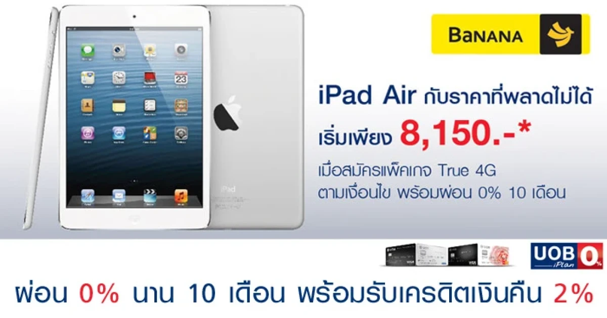 สิทธิพิเศษเฉพาะบัตรเครดิตยูโอบี ผ่อน 0% นาน 10 เดือน พร้อมรับเครดิตเงินคืนสูงสุด 2% เมื่อซื้อ iPad Air กับราคาที่พลาดไม่ได้ เริ่มต้นเพียง 8,150 บาท เมื่อสมัครแพ็คเกจ True 4G ตามเงื่อนไข ณ ร้านบานาน่า โมบาย (จำกัดรับเครดิตเงินคืนสูงสุด 1,000 บาท/ บัตร ตลอดรายการ)