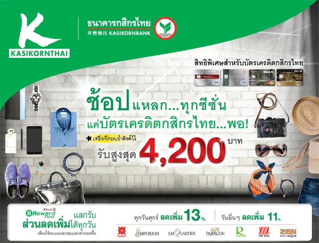 ช้อปแหลก.. ทุกซีซั่น รับเงินคืนสูงสุด 4,200 บาท พร้อมใช้คะแนนสะสม Kbank Reward Point แลกรับส่วนลดสูงสุด 13% ที่ห้างสรรพสินค้าชั้นนำ ที่ร่วมรายการ จาก บัตรเครดิตกสิกรไทย