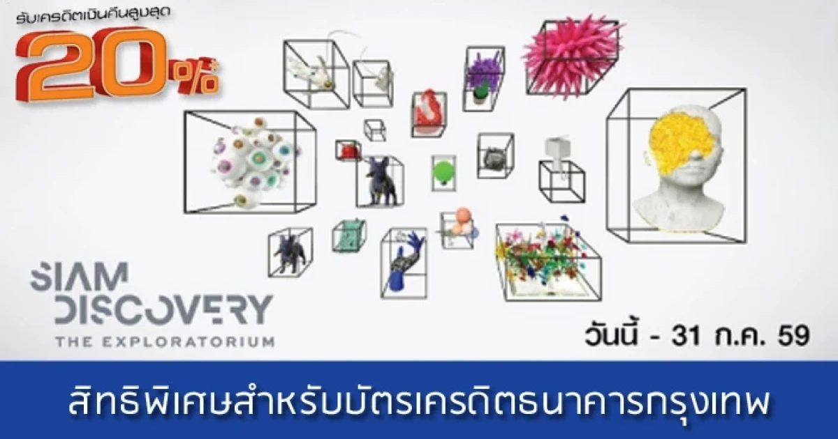 รับเครดิตเงินคืนสูงสุด 20% เมื่อช้อปสินค้าที่ Siam Discovery ในวันศุกร์ เสาร์ อาทิตย์ ด้วยบัตรเครดิต ธนาคารกรุงเทพ (จำกัดรับเครดิตเงินคืนสูงสุด 30,000 บาท ต่อบัญชีบัตร ตลอดรายการ)