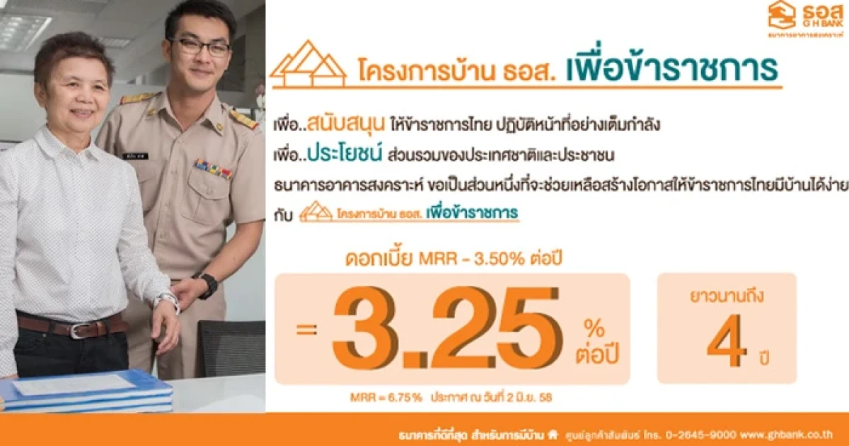 โครงการบ้าน ธอส. เพื่อข้าราชการ จากธนาคารอาคารสงเคราะห์ สร้างโอกาสให้ข้าราชการไทยมีบ้านได้ง่ายขึ้น ด้วยอัตราดอกเบี้ยเงินให้กู้ต่ำเพียง 3.25% ต่อปี นานถึง 4 ปี