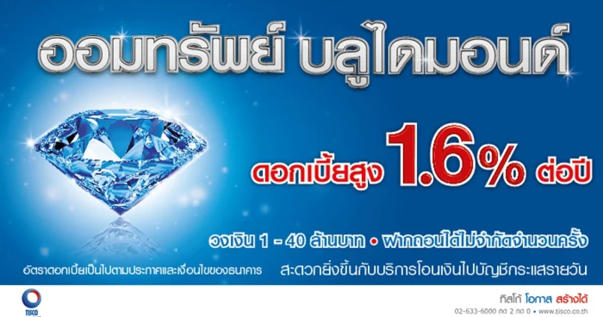 บัญชีเงินฝากออมทรัพย์บลูไดมอนด์ ดอกเบี้ยสูง 1.60% ต่อปี ฝากถอนได้ไม่จำกัดจำนวนครั้ง จาก ธ. ทิสโก้