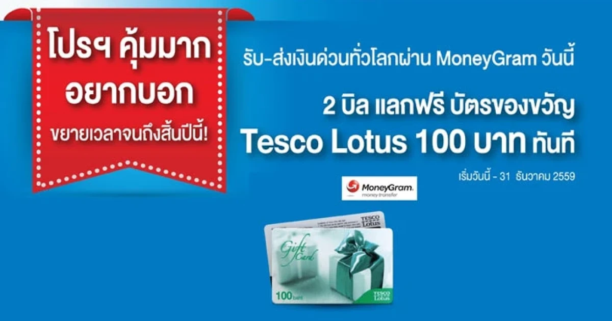 โปรฯ คุ้มมาก อยากบอก ขยายเวลาจนถึงสิ้นปีนี้! ลูกค้าทีเอ็มบี วันนี้เพียงรับ-ส่งเงินผ่าน Money Gram รับฟรีทันที! บัตรของขวัญ Tesco Lotus มูลค่า 100 บาท เพียงทำรายการส่งเงินไปต่างประเทศ หรือรับเงินจากต่างประเทศผ่านบริการ MoneyGram จำนวน 2 รายการ มีสิทธิ์รับบัตรของขวัญของ Tesco Lotus มูลค่า 100 บาท ณ จุดขายที่ร่วมรายการ โดยสามารถสะสมใบเสร็จเพื่อนำมาแลกคูปองได้ตามระยะเวลาโปรโมชั่น