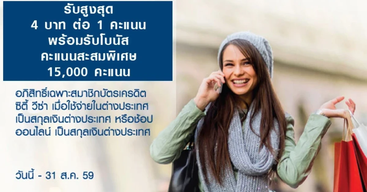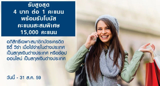 อภิสิทธิ์เฉพาะสมาชิกบัตรเครดิตซิตี้ วีซ่า รับสูงสุด 4 บาท ต่อ 1 คะแนน พร้อมรับโบนัสคะแนนสะสมพิเศษ 15,000 คะแนน เมื่อใช้จ่ายในต่างประเทศ เป็นสกุลเงินต่างประเทศ หรือช้อปออนไลน์ เป็นสกุลเงินต่างประเทศ