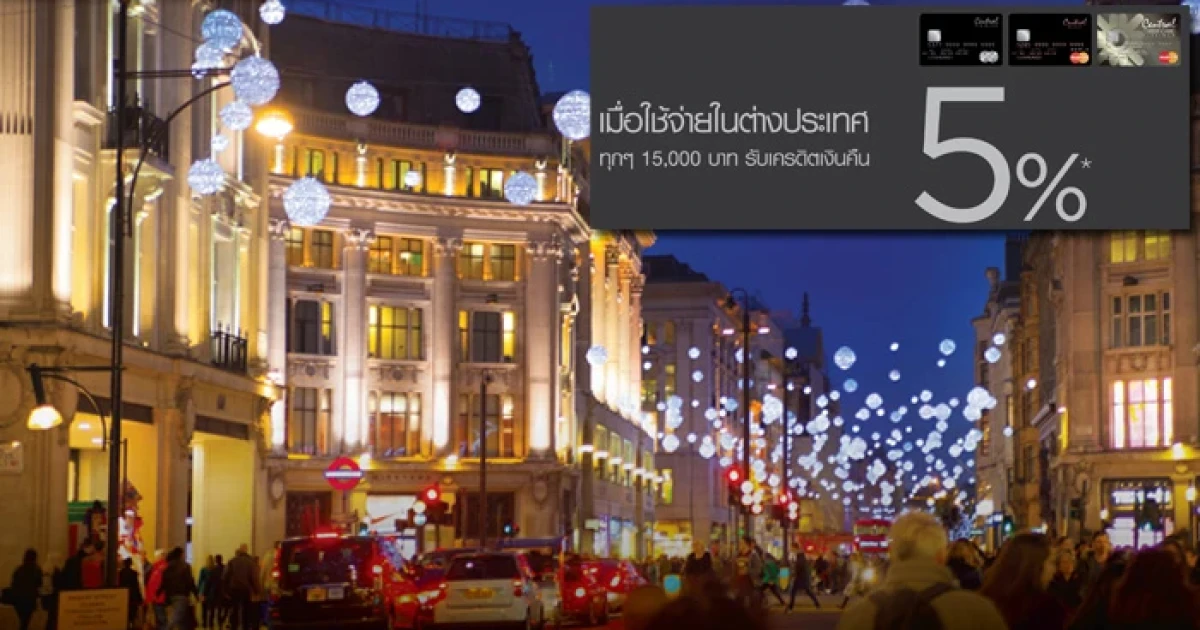 รับเงินคืน 5% เมื่อใช้จ่ายที่ต่างประเทศ ทุกๆ 15,000 บาท ด้วยบัตรเซ็นทรัล เครดิตคาร์ด