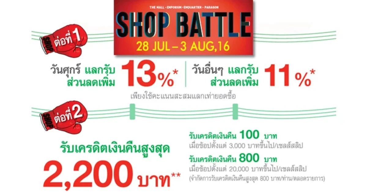 ช้อปดวลแชมป์ รับส่วนลดสูงสุด 13% และรับเครดิตเงินคืนสูงสุด 2,200 บาท เมื่อซื้อช้อปที่ห้างสรรพสินค้า ได้แก่ The Mall, The Emporium, The Emquartier และ Siam Paragon ผ่านบัตรเครดิตกสิกรไทย