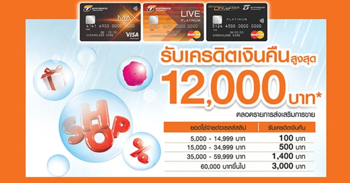 - การรับเครดิตเงินคืนขอสงวนสิทธิ์เฉพาะสมาชิกที่มียอดใช้จ่ายผ่านบัตรฯ ตั้งแต่ 5,000 บาทขึ้นไป/ หมายเลขบัตร/ เซลล์สลิป โดยธนาคารฯ จะเครดิตเงินคืนตามแต่ละช่วงของวงเงินยอดใช้จ่าย/ หมายเลขบัตร/ เซลล์สลิป (ตามตาราง)