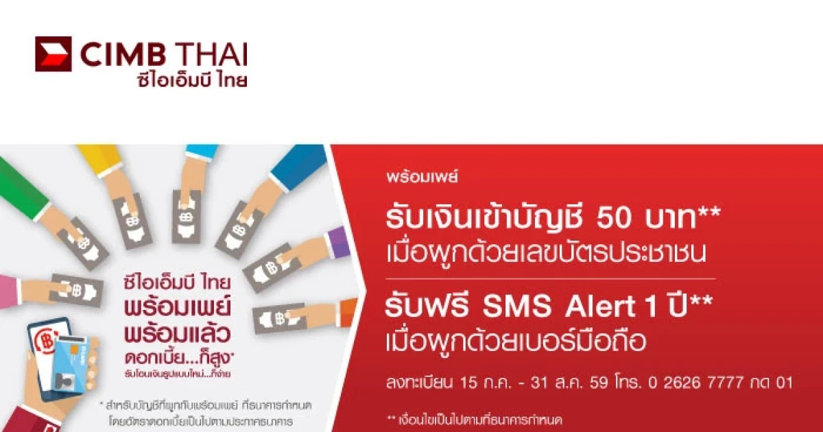ซีไอเอ็มบี ไทย พร้อมเพย์ พร้อมแล้ว...ให้คุณสนุกกับการเงินใหม่ที่ง่ายขึ้นทุกวัน รับ-โอนเงินระหว่างกันรูปแบบใหม่ช่วยให้การรับเงินโอนของคุณเป็นเรื่องง่าย และสะดวกยิ่งขึ้น ไม่ต้องจำ หรือบอกเลขบัญชีอีกต่อไป แค่ผูกบัญชี ซีไอเอ็มบี ไทย พร้อมเพย์ ด้วยเลขบัตรประชาชน และ/หรือเบอร์มือถือ แทนเลขที่บัญชีธนาคาร