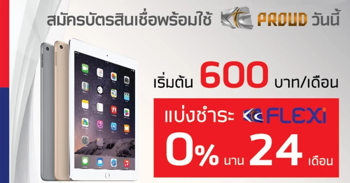 สมัครบัตรสินเชื่อพร้อมใช้ KTC PROUD เฉพาะร้านค้าที่ร่วมรายการวันนี้ รับสิทธิ์แบ่งชำระ iPad Air2 16GB, 64 GB ด้วย KTC FLEXI 0% นาน 24 เดือน เริ่มต้น 600 บาท/เดือน