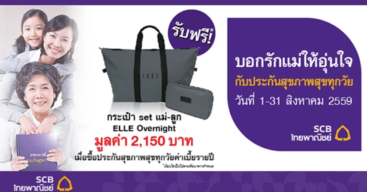 ธ.ไทยพาณิชย์ ชวนคุณมาบอกรักแม่ให้อุ่นใจ พร้อมรับฟรี! กระเป๋าเซตแม่-ลูก ELLE Overnight Bag มูลค่า 2,150 บาท เมื่อซื้อประกันสุขภาพสุขทุกวัย ค่าเบี้ยประกันรายปี คุ้มครองค่ารักษาพยาบาลทั้งกรณีผู้ป่วยในและผู้ป่วยนอกจากการบาดเจ็บหรือป่วย