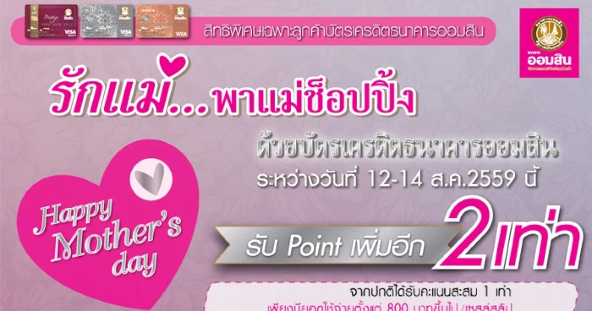 Happy Mother's Day รักแม่.. พาแม่ช้อปปิ้ง รับคะแนนสะสมเพิ่ม 2 เท่า (จากปกติได้รับคะแนนสะสม 1 เท่า) เพียงมียอดใช้จ่ายตั้งแต่ 800 บาทขึ้นไป/ เซลล์สลิป ผ่านบัตรเครดิตธนาคารออมสิน