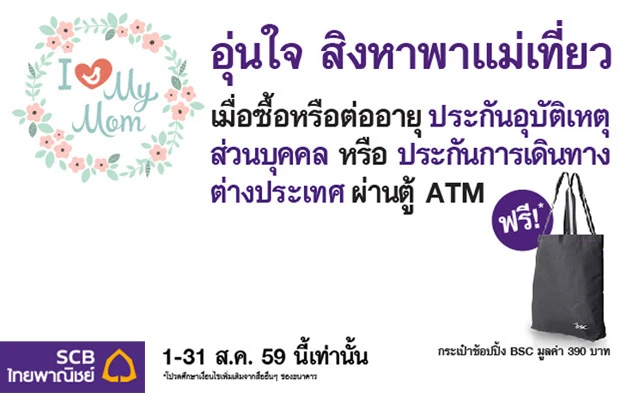 ฟรี! กระเป๋าช้อปปิ้ง BSC 1 ใบ มูลค่า 390 บาท เมื่อซื้อหรือต่ออายุ ประกันอุบัติเหตุส่วนบุคคล หรือ ประกันการเดินทางต่างประเทศ ผ่านตู้ ATM ธนาคารไทยพาณิชย์